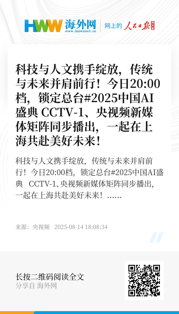 科技与人文携手绽放,传统与未来并肩前行!今日20:00档,锁定总台#2025中国AI盛典 CCTV-1、央视频新媒体矩阵同步播出,一起在上海共赴美好未来!