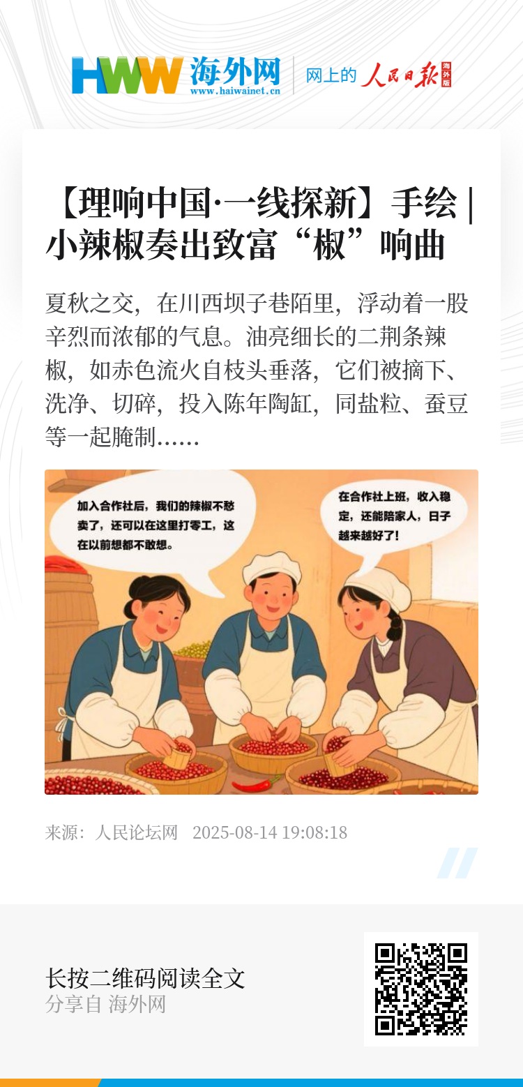 夏秋之交,在川西坝子巷陌里,浮动着一股辛烈而浓郁的气息。油亮细长的二荆条辣椒,如赤色流火自枝头垂落,它们被摘下、洗净、切碎,投入陈年陶缸,同盐粒、蚕豆等一起腌制,经过时间沉淀形成豆瓣酱。近年来,四川省成都市新津区普兴街道天宫社区大胆探索“基层治理+产业发展”的集体经济可持续发展新路径,制定“闭环式”发展策略,推动辣椒产业向标准化、品牌化、市场化方向发展,有效促进农业增产、村民增收,助力乡村全面振兴。
