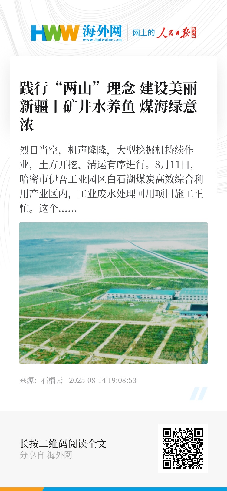 “水害”变“水利”,戈壁变绿洲。在哈密市伊州区大南湖矿区,徐矿集团哈密能源有限公司大南湖5号煤矿实现井下高盐矿井水综合处理和利用。2022年以来,该公司在戈壁荒滩上建成了绿化地,2024年获评自治区绿色矿山。今年该公司“高盐渍区矿井水生态治理与资源化利用”项目入选新疆国土空间生态修复典型案例库,成为全疆首个高盐矿井水大规模绿化造林示范工程。(石榴云/新疆日报记者 魏永贵)