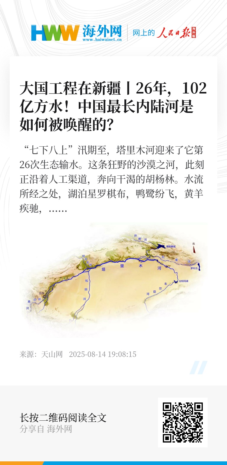2025年8月5日,塔里木河启动了第26次生态输水的第二阶段工程。从2000年首次实施生态输水以来,大西海子水库累计下泄生态水约102亿立方米。