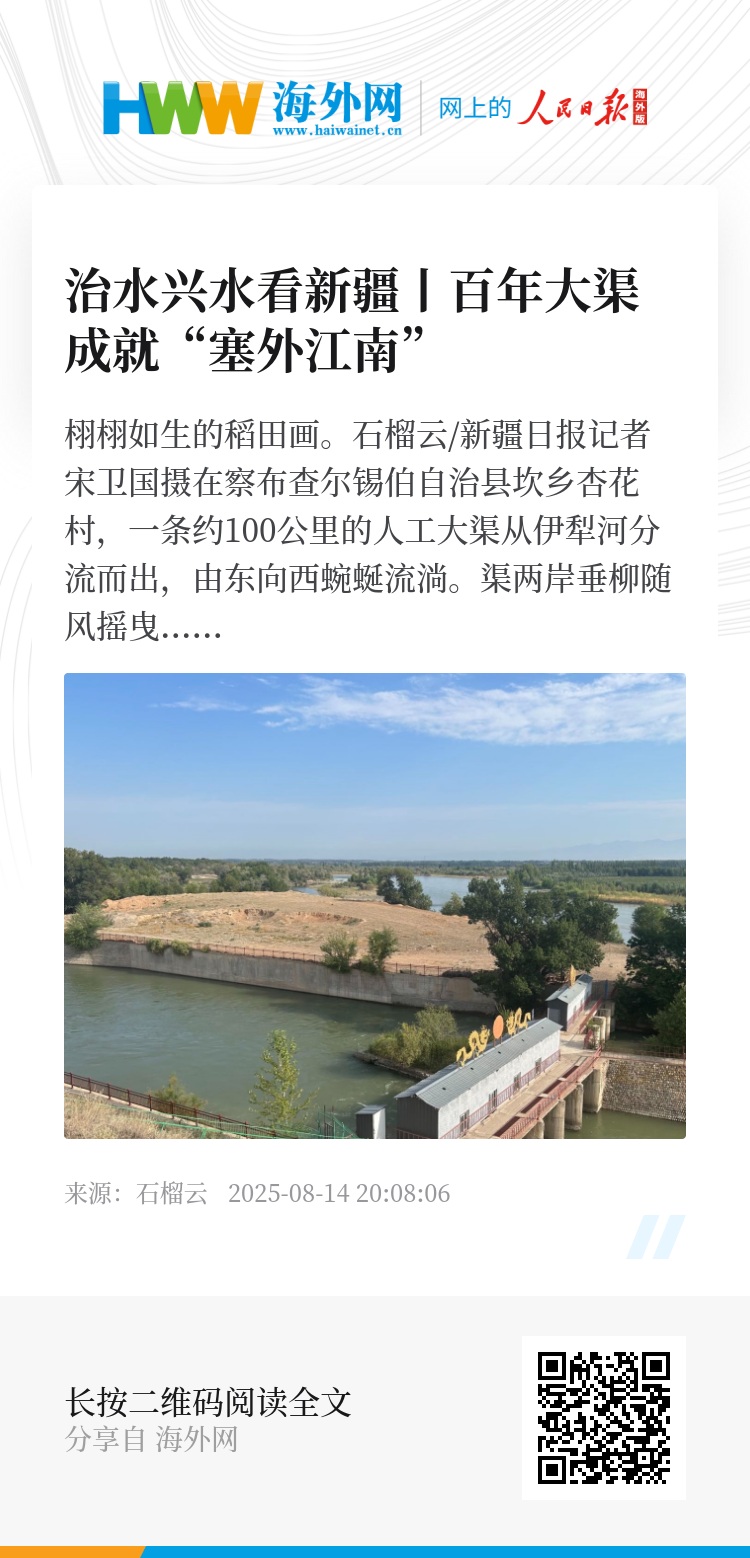 在察布查尔锡伯自治县坎乡杏花村,一条约100公里的人工大渠从伊犁河分流而出,由东向西蜿蜒流淌。渠两岸垂柳随风摇曳,各类水鸟在此栖息,渠水浇灌着流域的12个乡镇场的34万多亩土地。水稻长势旺盛,南北大对虾、小龙虾、中华绒毛蟹在水塘中茁壮成长,一幅幅稻田画吸引着不少游客前来拍照打卡。