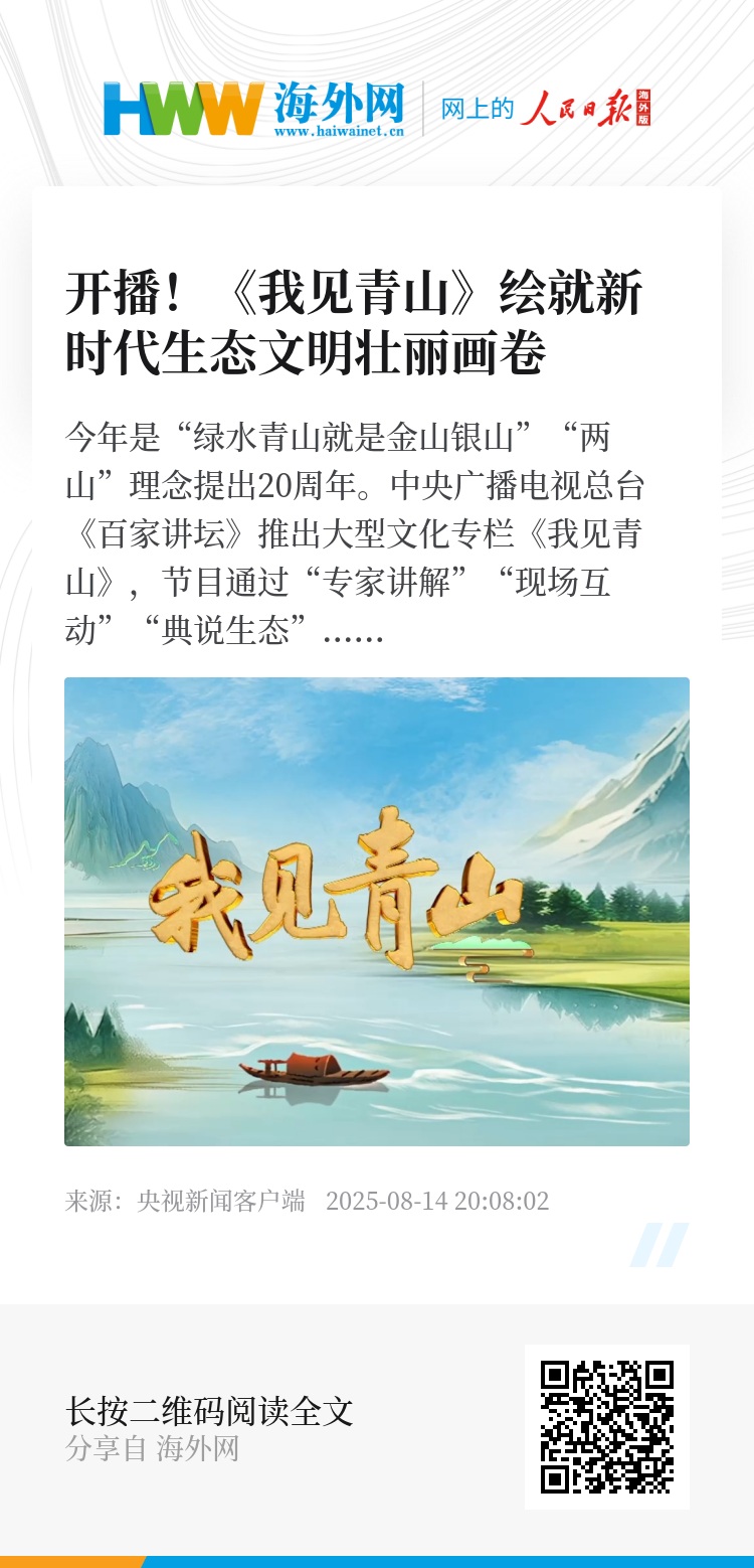 《我见青山》将于2025年8月15日至26日每天12:00在总台央视科教频道(CCTV-10)《百家讲坛》栏目播出,央视频同步上线。