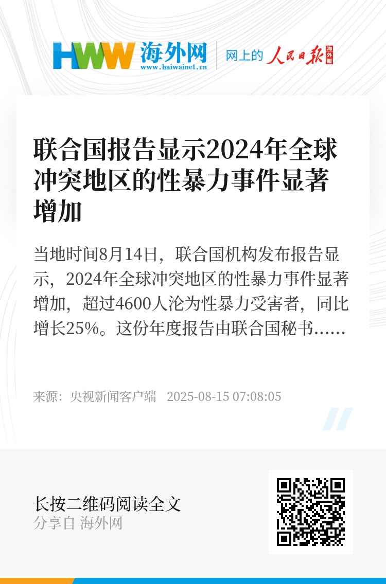 当地时间8月14日,联合国机构发布报告显示,2024年全球冲突地区的性暴力事件显著增加,超过4600人沦为性暴力受害者,同比增长25%。