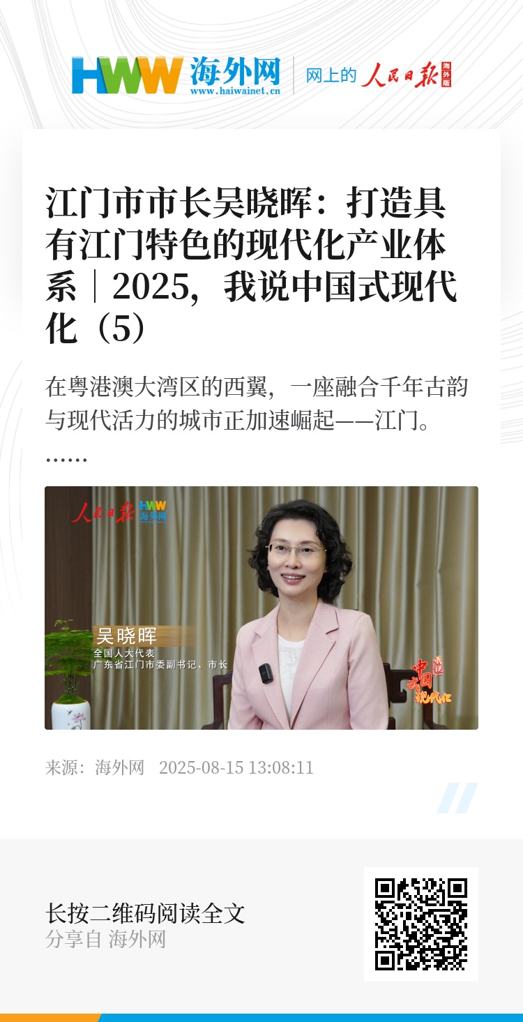在粤港澳大湾区的西翼,一座融合千年古韵与现代活力的城市正加速崛起——江门。这里不仅是530多万海外侨胞魂牵梦萦的“中国侨都”,更以蓬勃的产业动能、深厚的文化底蕴和优越的营商环境,不断吸引来自国内外的关注。近日,全国人大代表,广东省江门市委副书记、市长吴晓晖在接受人民日报海外网专访时表示,作为广东省重要的工业城市,江门坚持“工业立市、制造强市”,推动工业、建筑业、现代农业、商贸文旅等产业协同共进,着力打造具有江门特色的现代化产业体系。