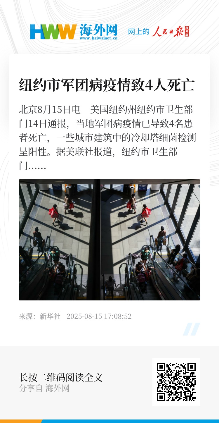 新华社北京8月15日电 美国纽约州纽约市卫生部门14日通报,当地军团病疫情已导致4名患者死亡,一些城市建筑中的冷却塔细菌检测呈阳性。