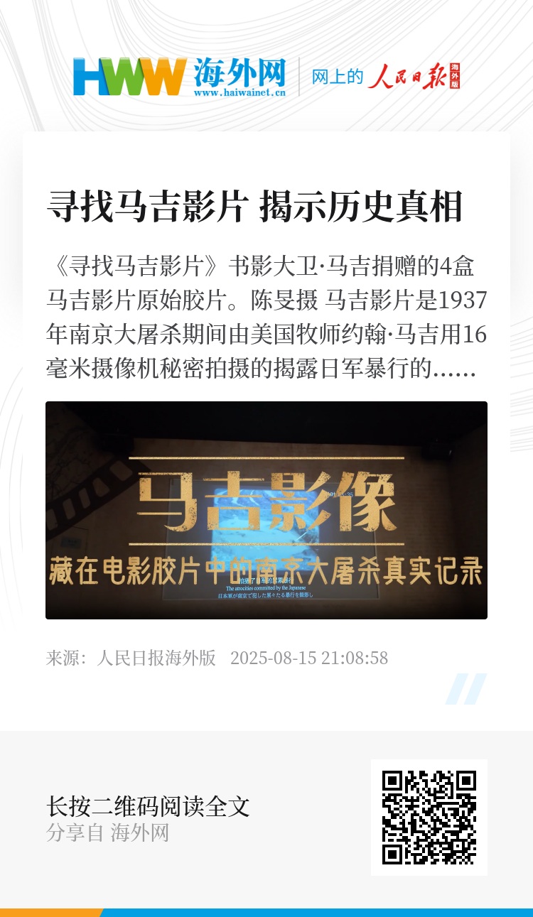 马吉影片是1937年南京大屠杀期间由美国牧师约翰·马吉用16毫米摄像机秘密拍摄的揭露日军暴行的影像。该影片与《拉贝日记》共同列入联合国教科文组织《世界记忆名录》,其中现藏于侵华日军南京大屠杀遇难同胞纪念馆的“37分钟版”,被认为是反映日军暴行最全面的核心证据之一。陈旻的《寻找马吉影片》(译林出版社)以纪实手法完整记录了中外各界人士历时20余年查访并寻回马吉影片的全过程。