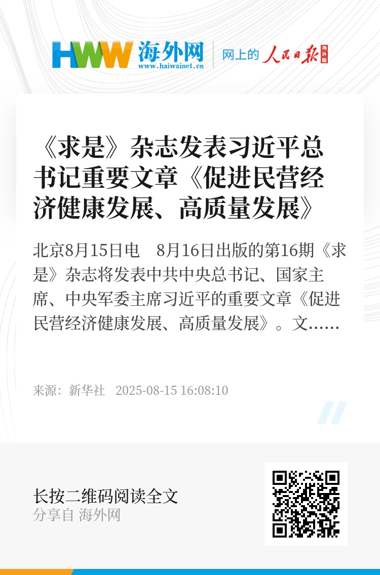 新华社北京8月15日电 8月16日出版的第16期《求是》杂志将发表中共中央总书记、国家主席、中央军委主席习近平的重要文章《促进民营经济健康发展、高质量发展》。