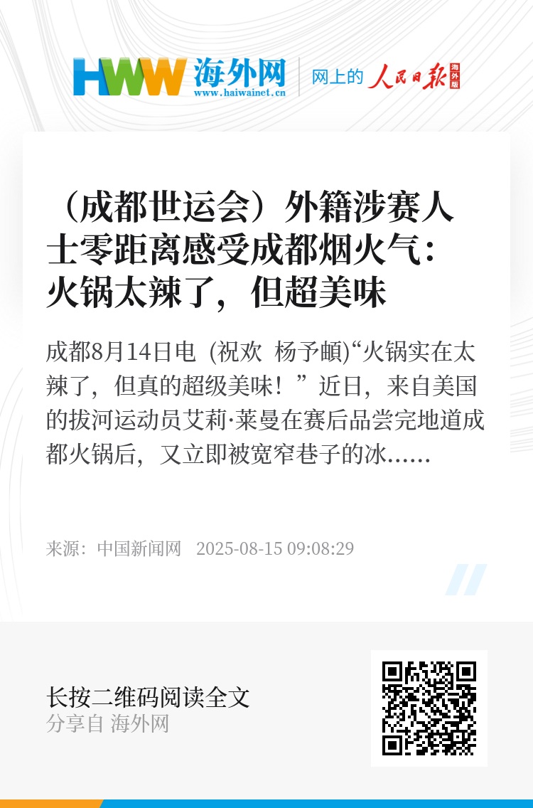 中新网成都8月14日电 (祝欢 杨予頔)“火锅实在太辣了,但真的超级美味!”近日,来自美国的拔河运动员艾莉·莱曼在赛后品尝完地道成都火锅后,又立即被宽窄巷子的冰镇果茶“圈粉”。