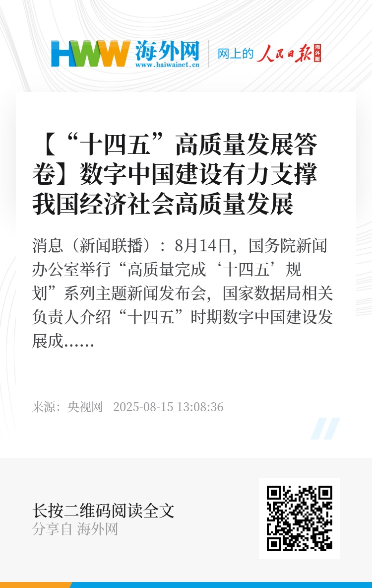 央视网消息(新闻联播):8月14日,国务院新闻办公室举行“高质量完成‘十四五’规划”系列主题新闻发布会,国家数据局相关负责人介绍“十四五”时期数字中国建设发展成就。