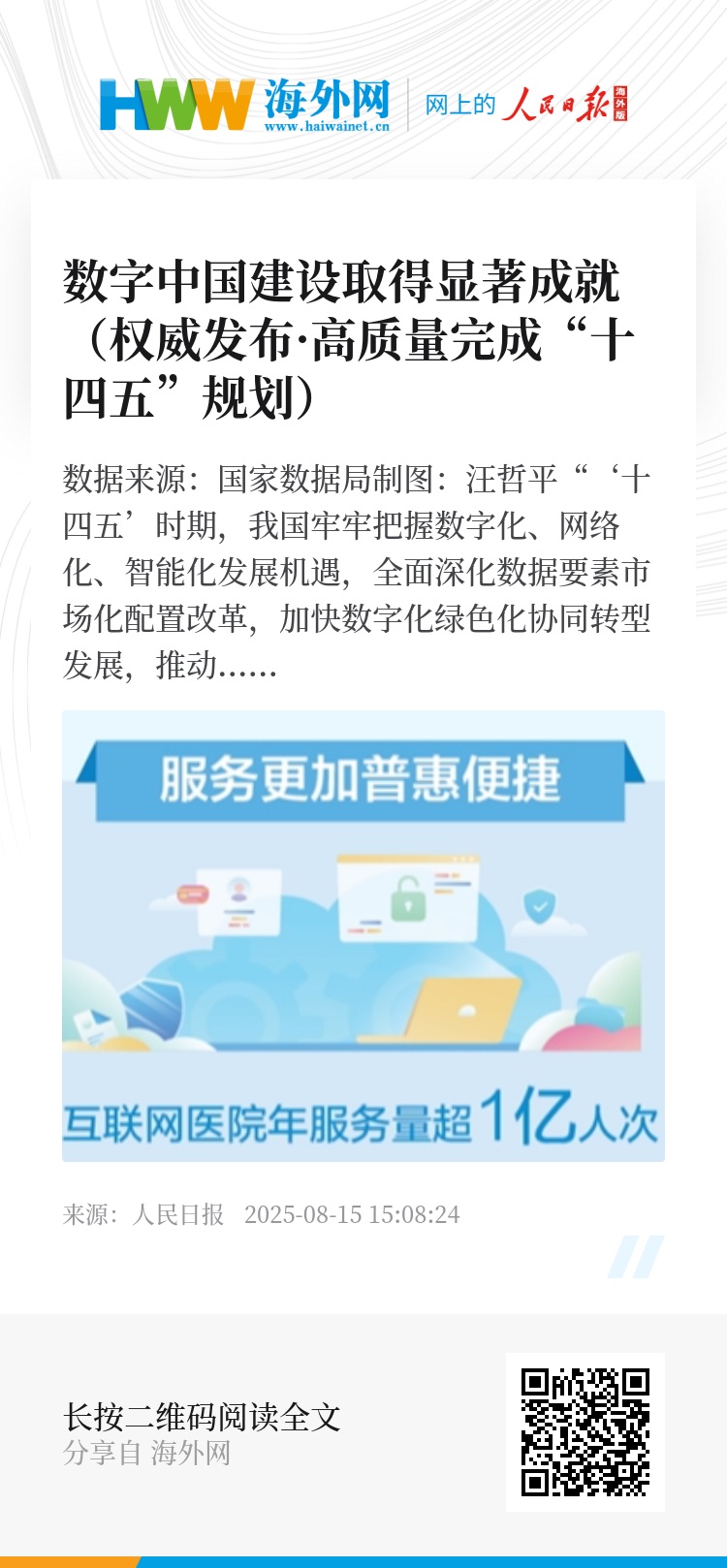 公共服务更加普惠便捷。智慧医疗服务扩面提速,全国互联网医院年服务量超过1亿人次,全国医保码用户超过12亿人,跨省异地就医直接结算惠及5.6亿人次。数字教育扩容升级,我国已建成全球规模最大、资源最丰富的国家智慧教育平台。数字社保扩围增效,全国10.7亿人领用电子社保卡,覆盖75%以上人口,长三角、成渝等城市群逐步实现“一卡通”区域服务互联互通。数字养老服务取得积极成效,全国养老服务信息平台上线,促进养老服务资源供需高效对接。