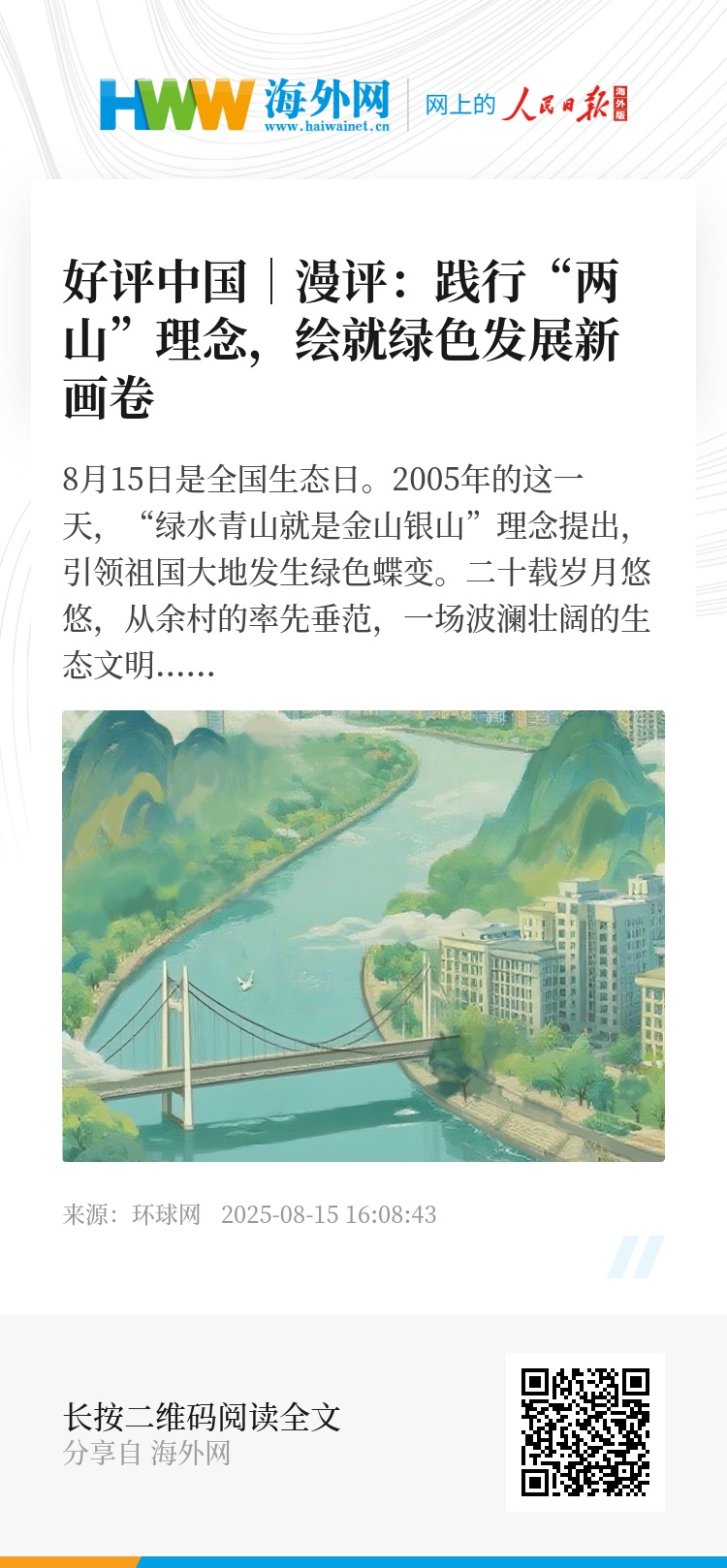 二十载风雨兼程,“两山”理念见证了中国生态文明建设的辉煌成就。展望未来,我们坚信,在“两山”理念的指引下,中国将继续勇立时代潮头,凝聚各方力量,让美丽中国的画卷在绿色发展中不断延展,为人类文明的永续发展贡献历久弥新的中国智慧与中国力量。(泰轩萍)