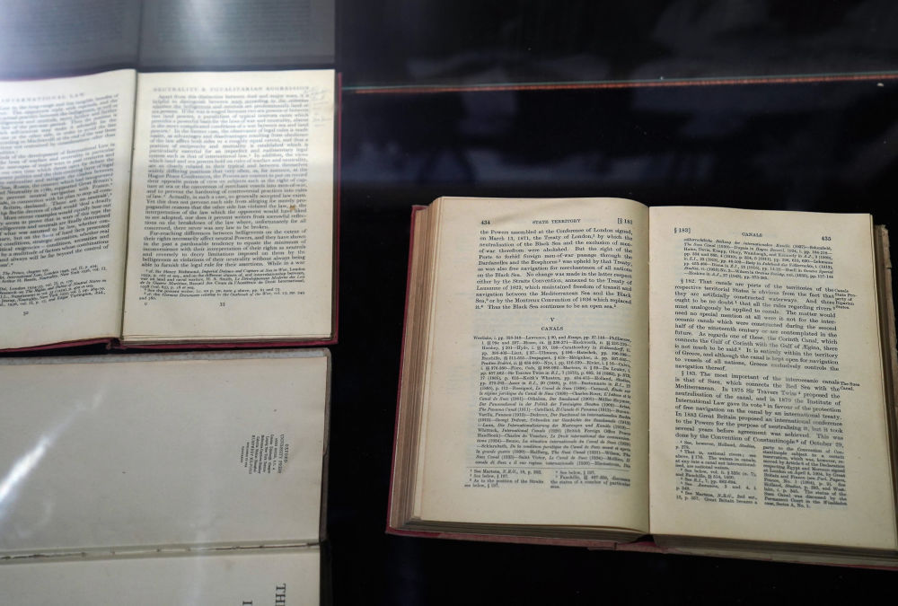 2025年8月1日在梅汝璈故居拍摄的梅汝璈在东京审判中用过的国际法专业工具书。