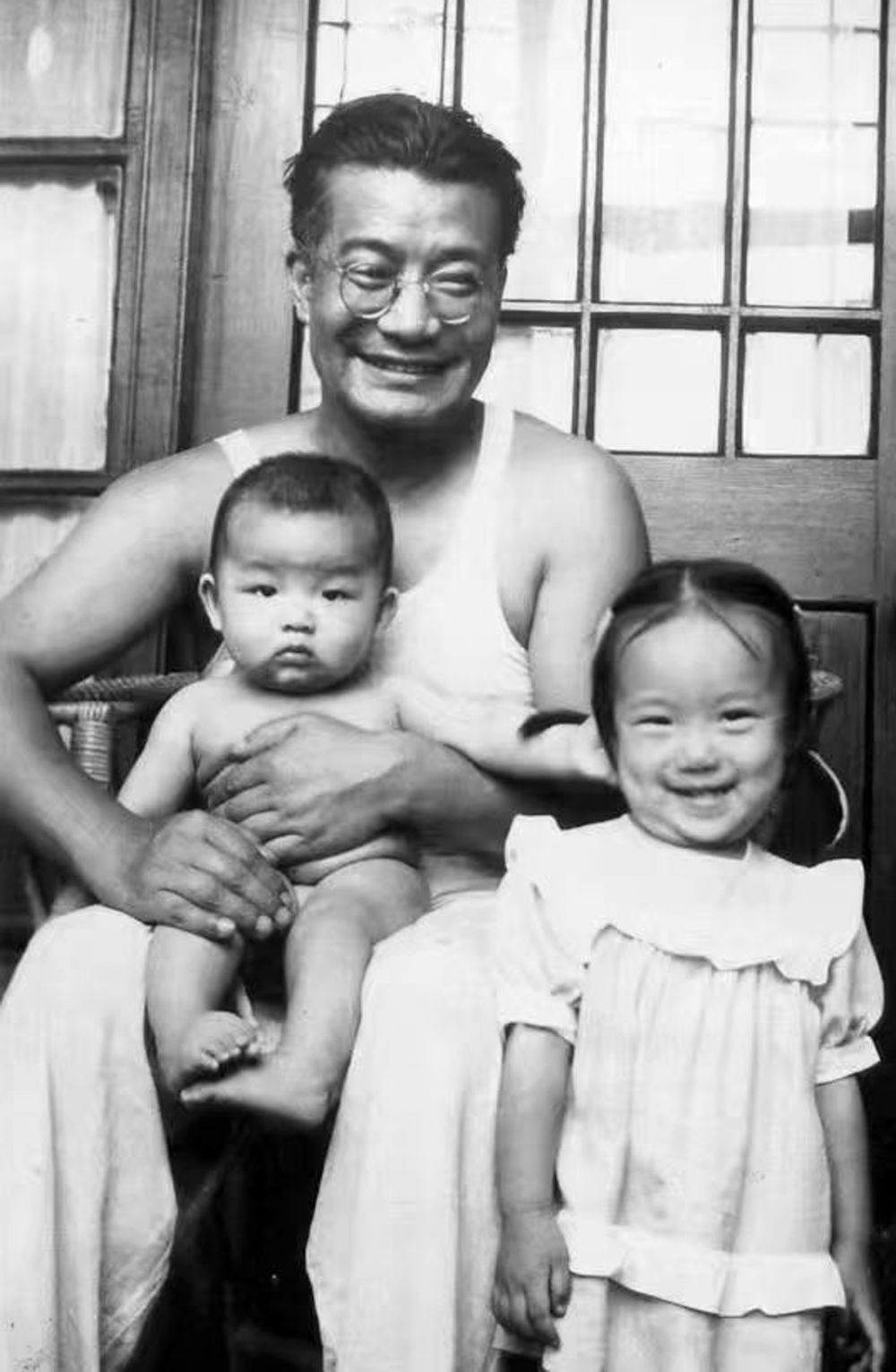 20世纪50年代,梅汝璈与儿子梅小璈(前左)、女儿梅小侃(前右)合影(资料照片)。