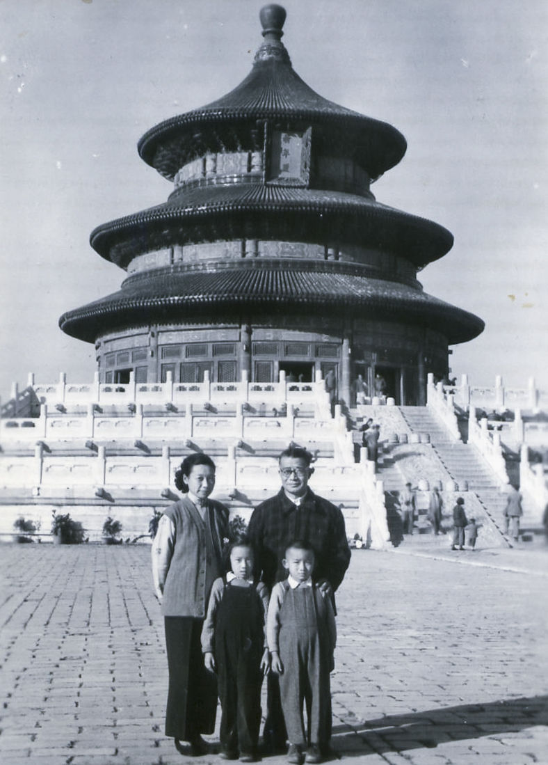 20世纪50年代末,梅汝璈(后右)与妻子萧侃(后左)、儿子梅小璈(前右)、女儿梅小侃(前左)在北京天坛公园合影(资料照片)。