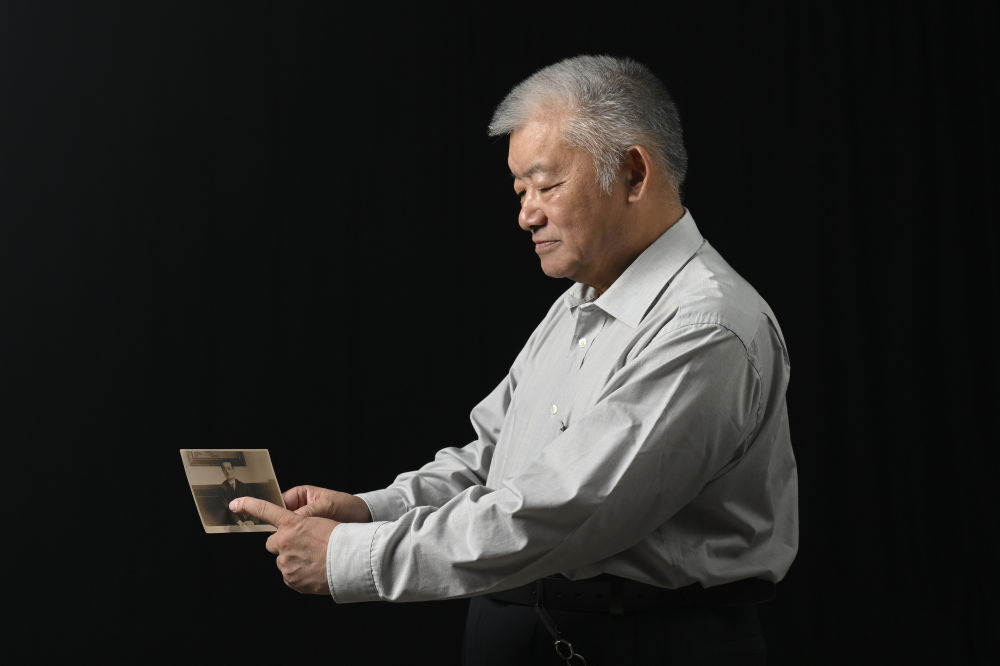 2025年8月8日,梅小璈端详父亲梅汝璈的照片。