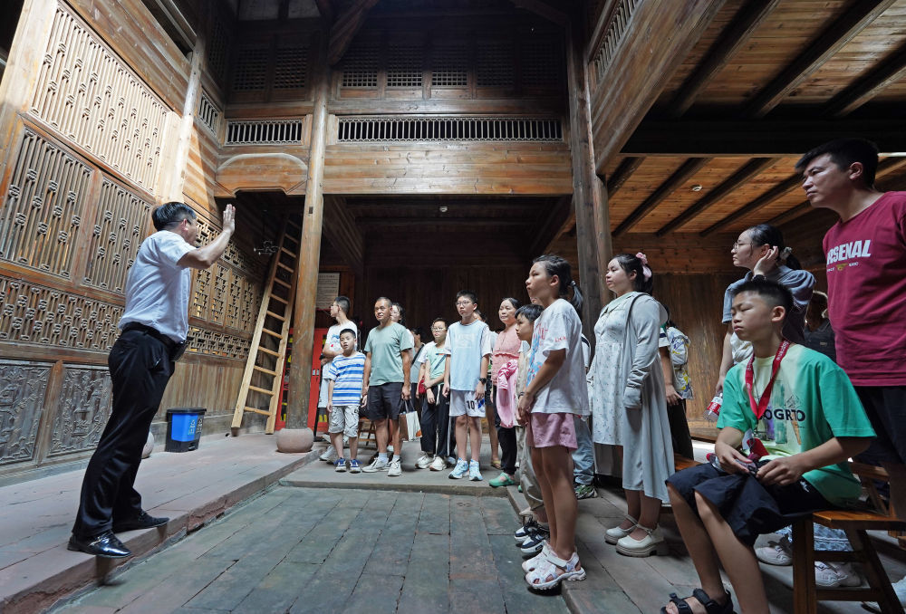 2025年8月1日,梅汝璈故居讲解员梅庭军(左一)向游客介绍梅汝璈。