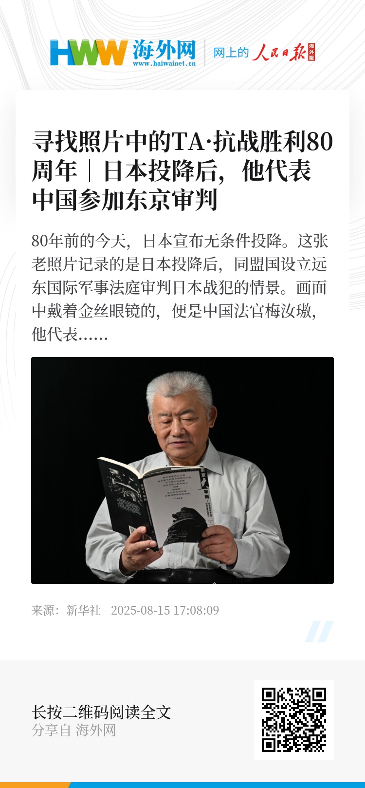 2025年8月8日,梅小璈在阅读父亲梅汝璈所著书籍《东京大审判——远东国际军事法庭中国法官梅汝璈日记》。