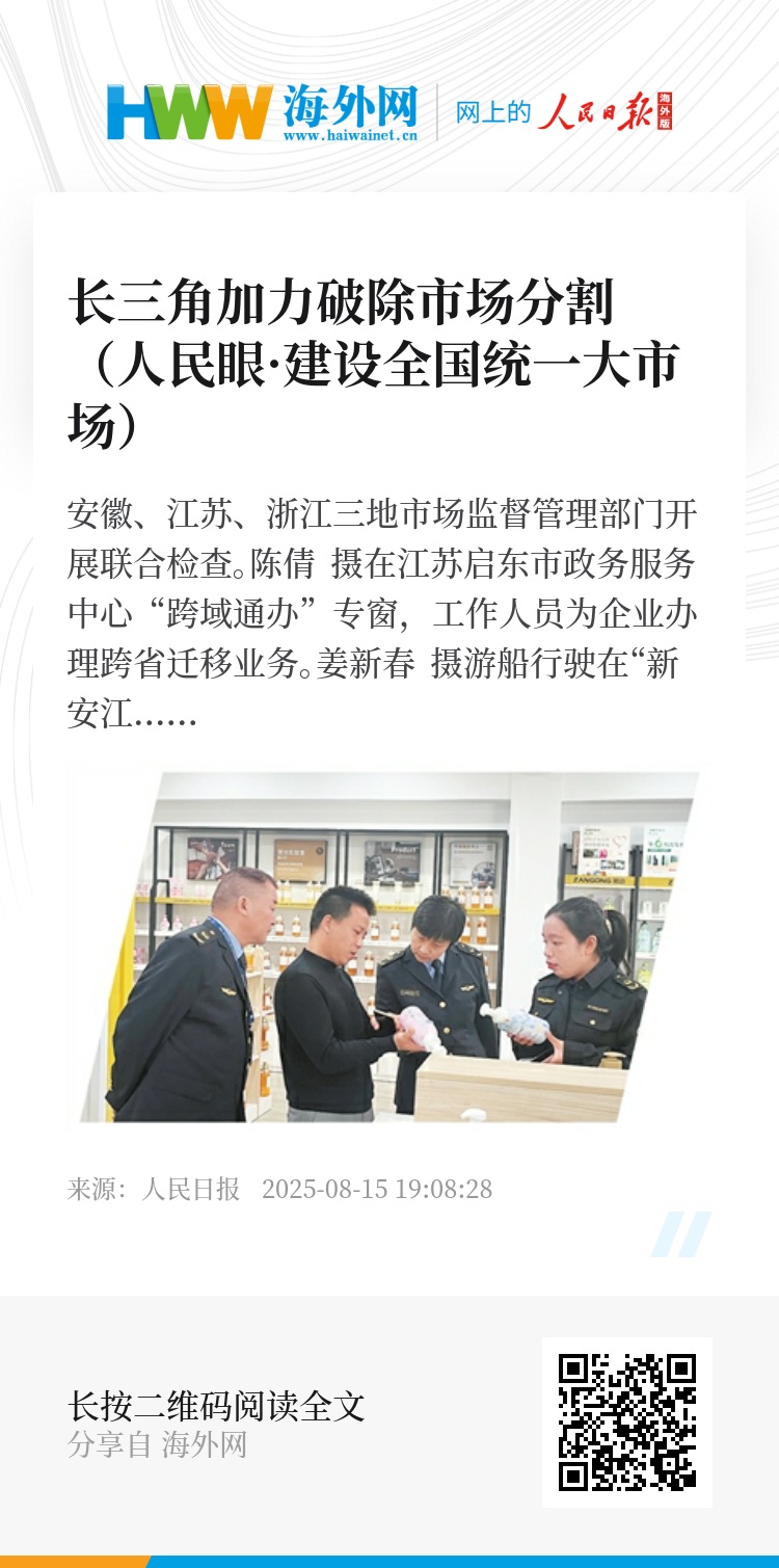 今年初发布的《全国统一大市场建设指引(试行)》提出,“鼓励有条件的地区开展区域市场一体化建设”。作为我国经济发展最活跃、开放程度最高、创新能力最强的区域之一,长三角区域市场一体化,有助于为推进全国统一大市场建设开辟道路、创造条件、积累经验。