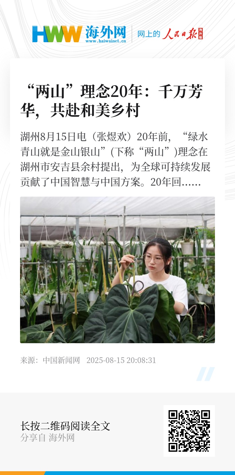 中新网湖州8月15日电(张煜欢)20年前,“绿水青山就是金山银山”(下称“两山”)理念在湖州市安吉县余村提出,为全球可持续发展贡献了中国智慧与中国方案。