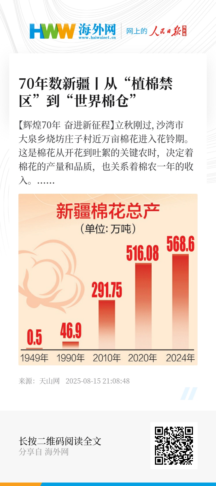 2024年,新疆棉花总产由1949年的0.5万吨增长至568.6万吨,产量占全国的比例由1.1%提升至92.2%,总产、单产连续30年全国第一。世界棉花看中国,中国棉花看新疆已是不争的事实。