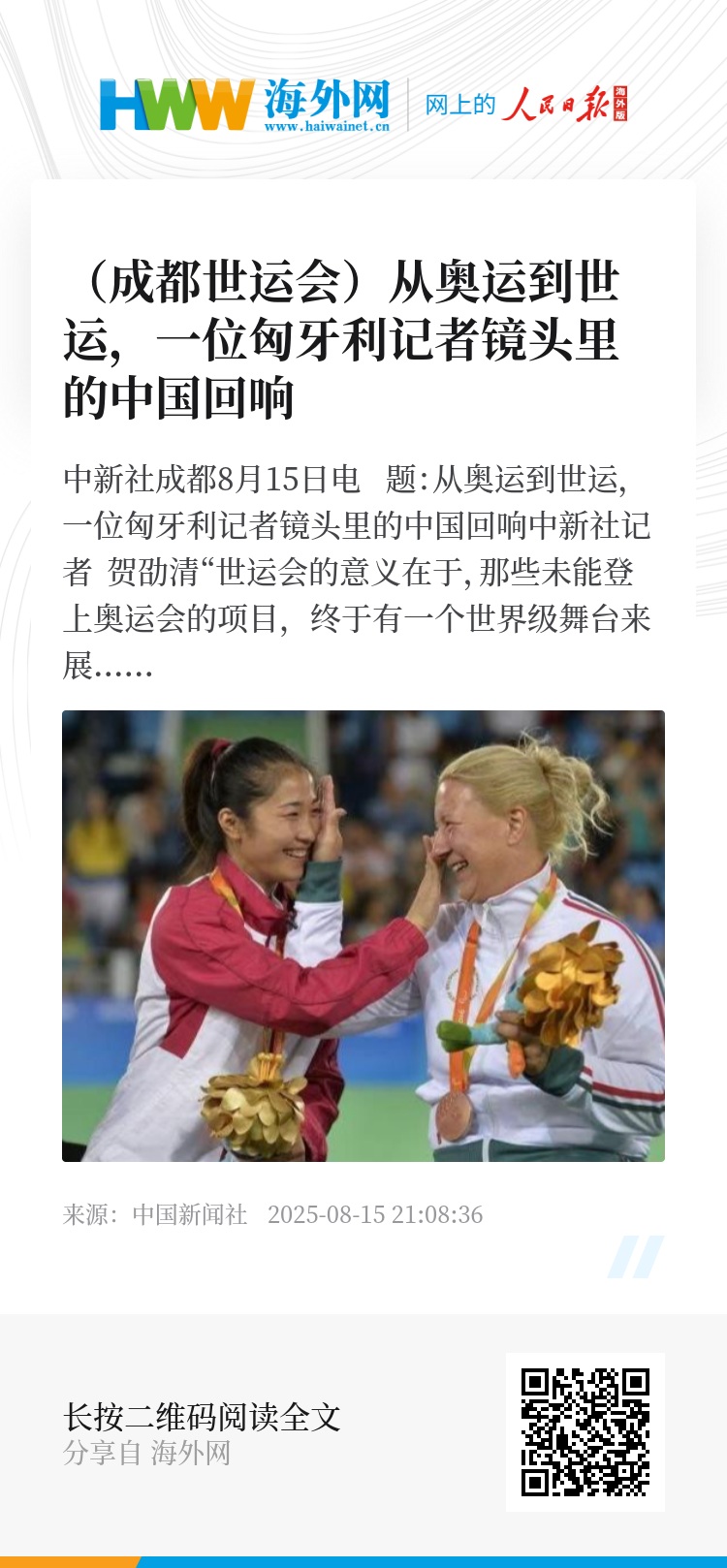 中新社成都8月15日电 题:从奥运到世运,一位匈牙利记者镜头里的中国回响