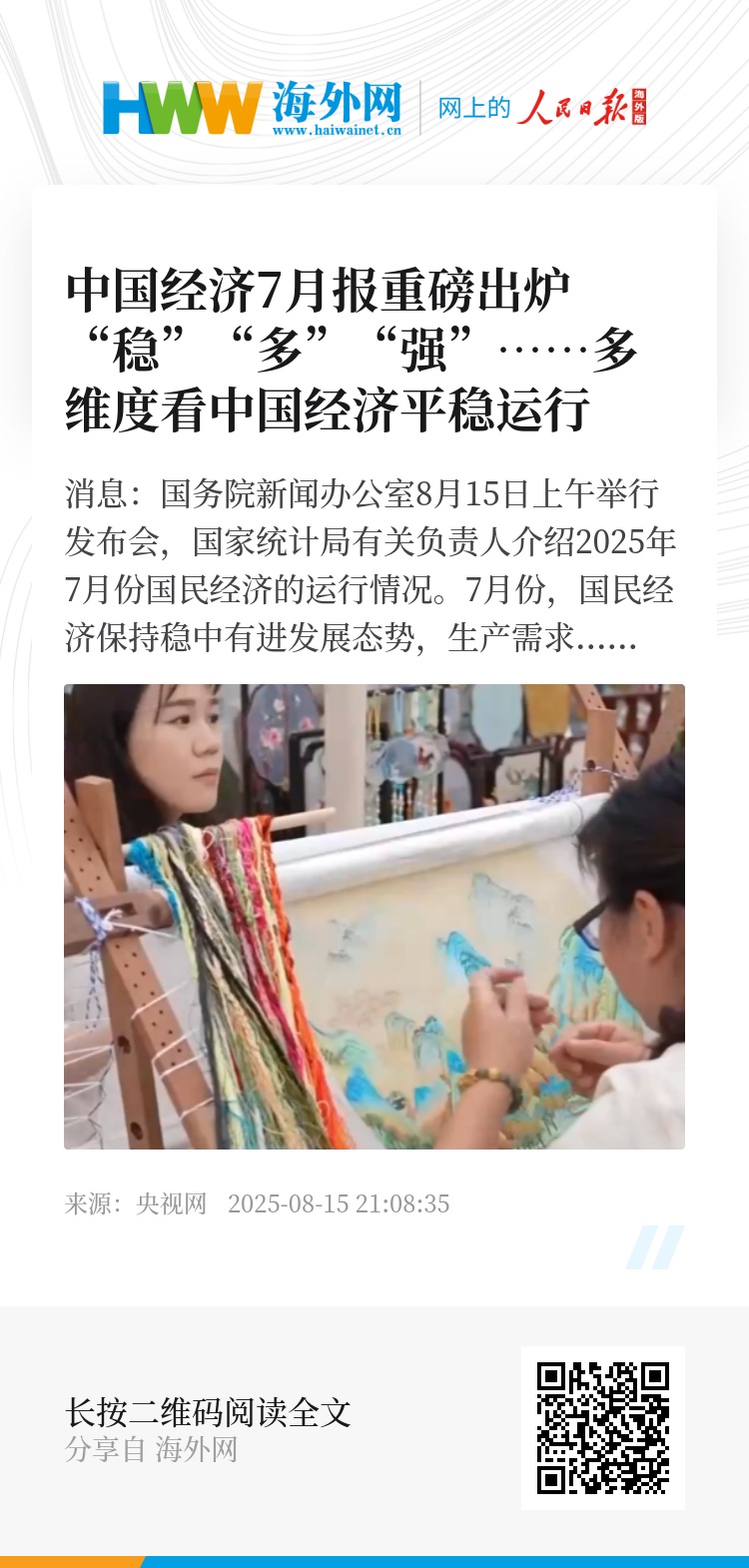 付凌晖表示,2025年以来,更加积极的宏观政策加紧实施。“两重”建设和大规模设备更新政策带动下,1—7月份,装备制造业增加值同比增长9.9%,水利、电力投资快速增长。随着在保障和改善民生中扩大消费需求,高质量推动“两重”建设等政策效果显现,将有利于推动经济平稳运行。