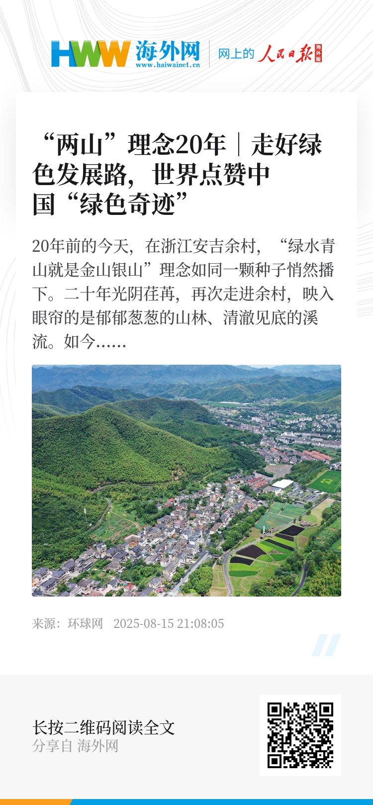 中国的“绿水青山”之路,是一条将生态保护置于发展核心、以绿色动能驱动未来的探索之路。“两山”理念带来了触手可及的生机,也正在塑造一个更富活力、更具可持续性的真实中国。放眼未来,中国将继续书写绿色发展的坚定承诺。