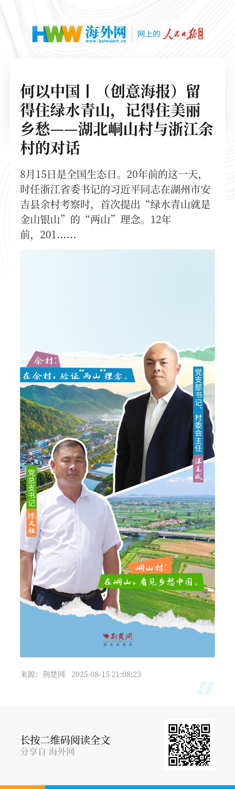 今天,荆楚网(湖北日报网)推出创意海报《留得住绿水青山,记得住美丽乡愁——湖北峒山村与浙江余村的对话》,展示中国乡村的美丽画卷。