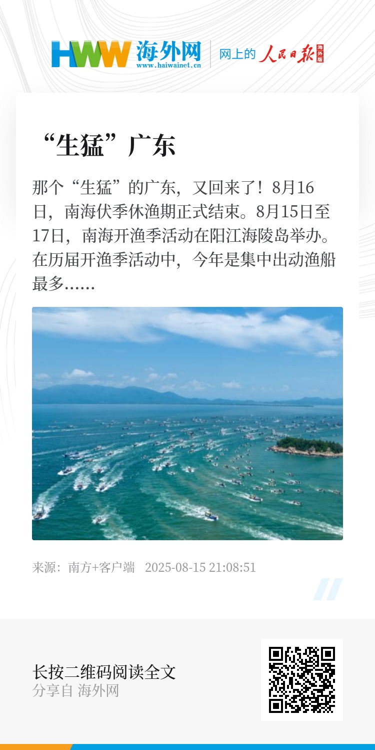 8月16日,南海伏季休渔期正式结束。8月15日至17日,南海开渔季活动在阳江海陵岛举办。