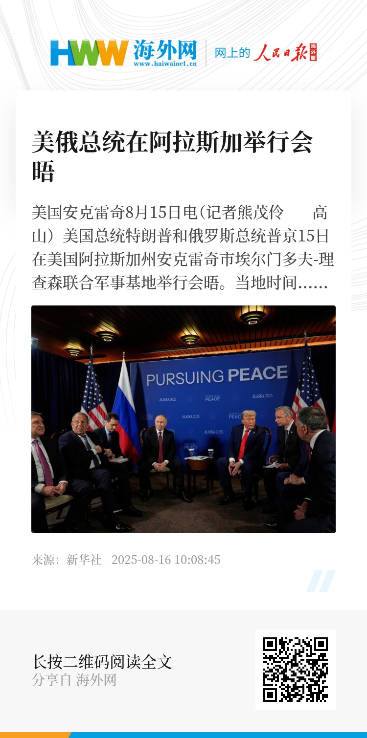 新华社美国安克雷奇8月15日电(记者熊茂伶 高山)美国总统特朗普和俄罗斯总统普京15日在美国阿拉斯加州安克雷奇市埃尔门多夫-理查森联合军事基地举行会晤。
