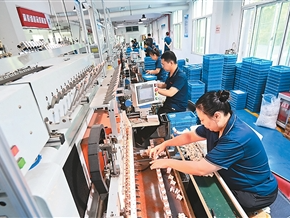 八月十五日,在山东省青州市王府街道一家电子元器件制造企业车间,工人在进行组装作业。