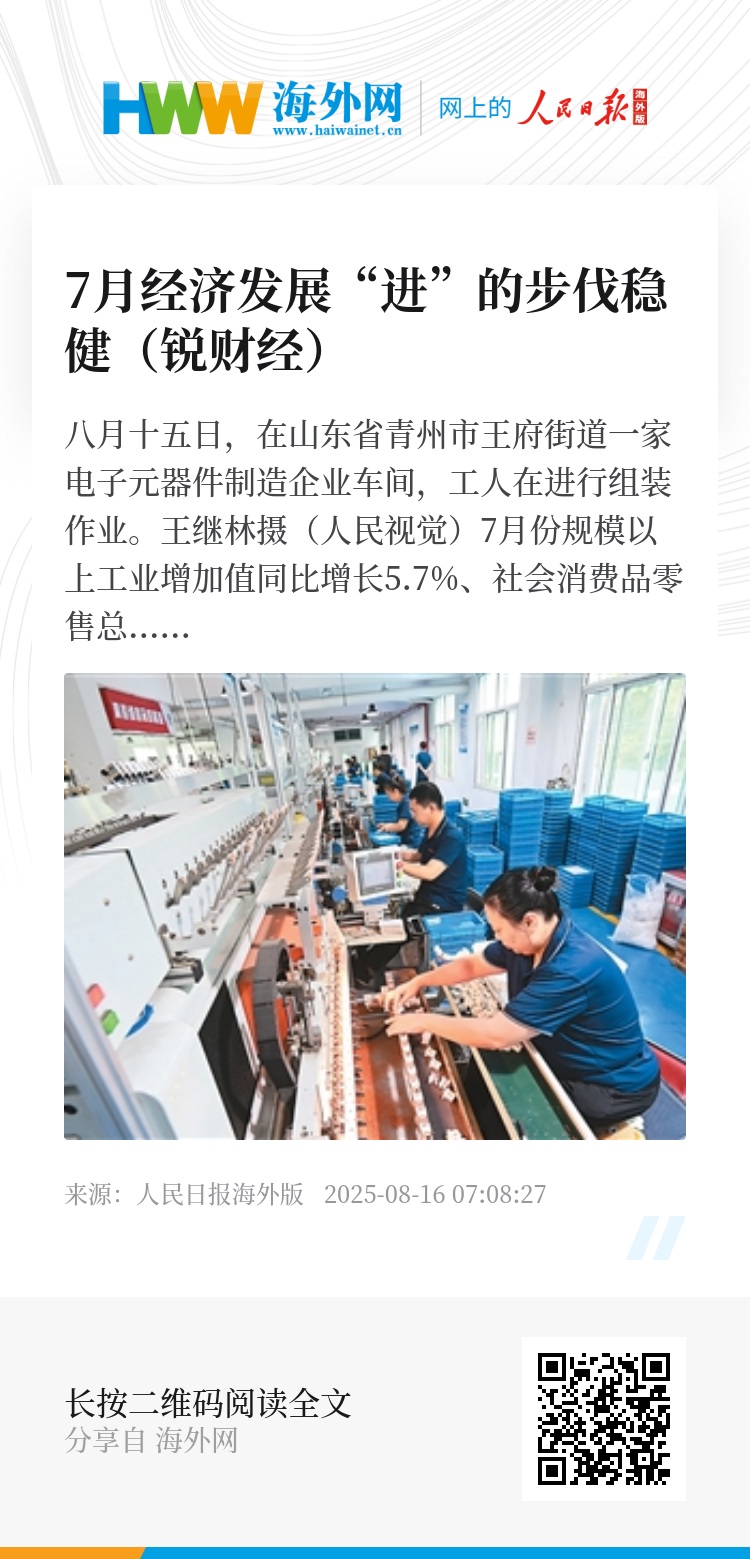 7月份规模以上工业增加值同比增长5.7%、社会消费品零售总额同比增长3.7%、货物进出口总额同比增长6.7%……国家统计局8月15日发布了7月国民经济“成绩单”。数据显示,国民经济保持稳中有进发展态势,生产需求持续增长,就业物价总体稳定,新质生产力培育壮大,高质量发展取得新成效。