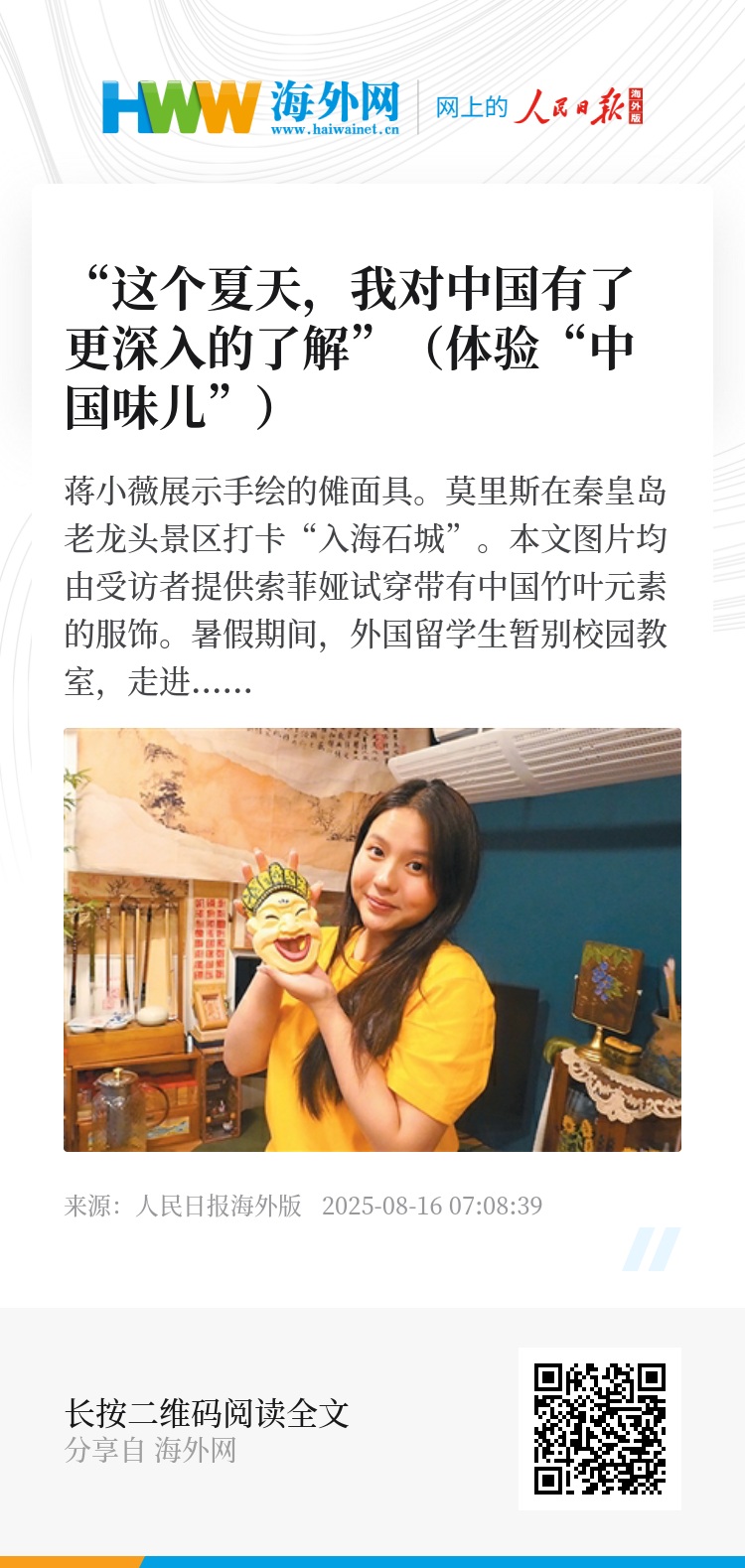 暑假期间,外国留学生暂别校园教室,走进更广阔的社会课堂:有的来到制造企业参访学习,见证科技创新赋能传统产业;有的走进非遗工坊动手创作,体验传统文化的独特魅力;还有的背上行囊、踏上旅途,领略山河壮美与城市脉动……形式多样的暑期活动,为他们打开了一扇扇感知立体中国的新窗口。