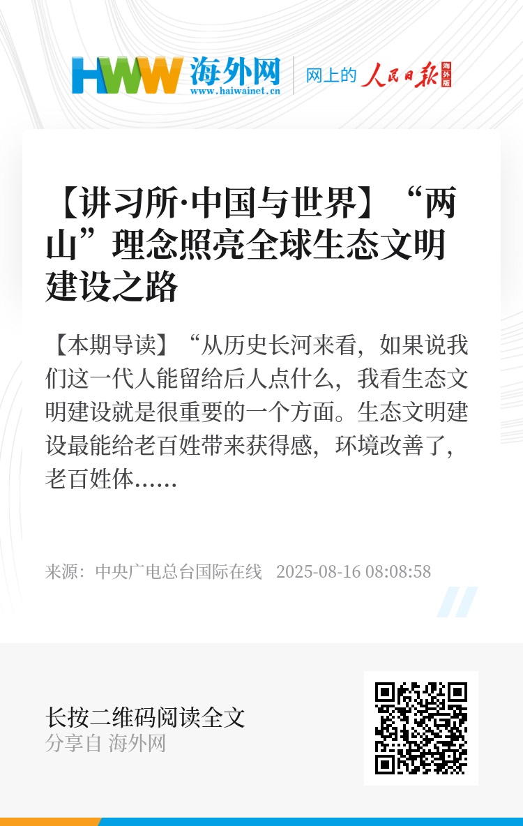 作为习近平生态文明思想的核心理念,“两山”理念不仅深刻重塑了中国经济社会全面发展的路径,更超越了地域局限,为全球可持续发展贡献东方智慧。国际社会认为,习近平主席提出“两山”理念是一项具有历史意义的变革性思想,这一理念超越了狭隘的功利主义与短期主义,在这个充满空前挑战与机遇的时代,为人类生态文明建设、实现人与自然和谐发展提供了成功范例。