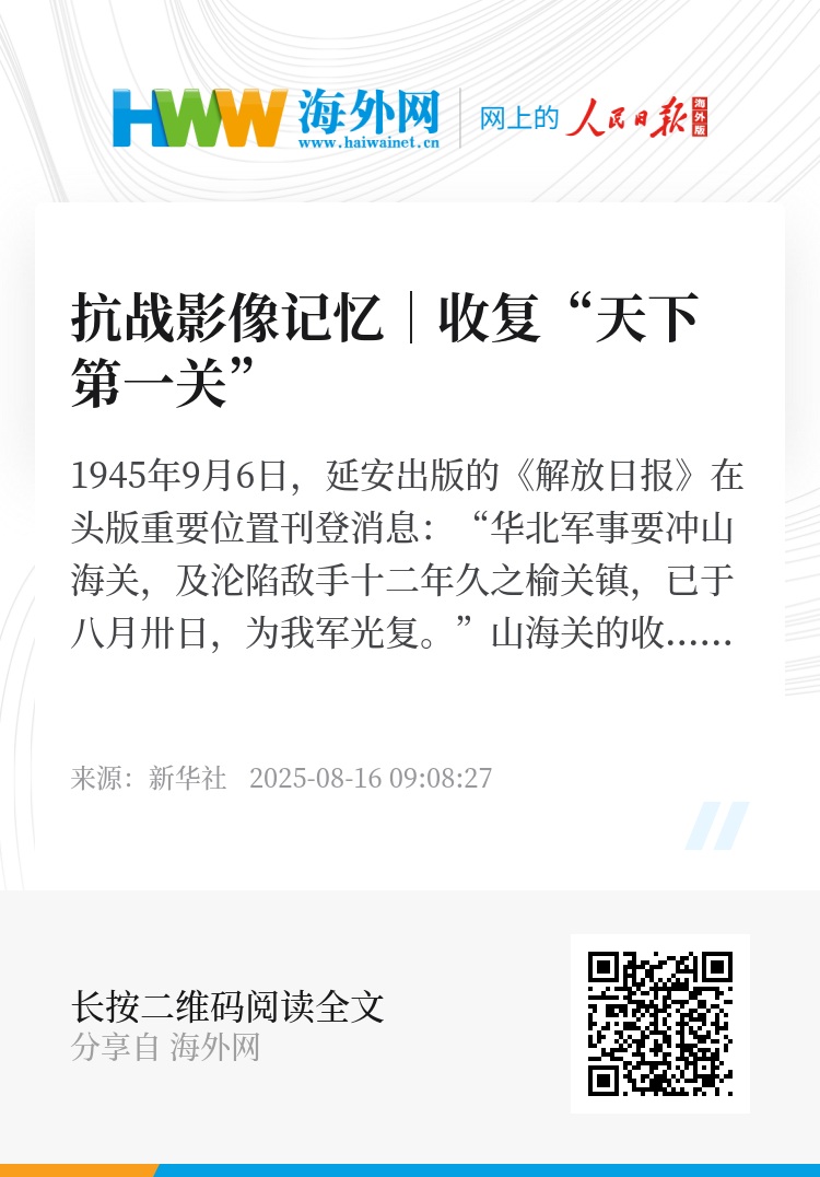 1945年9月6日,延安出版的《解放日报》在头版重要位置刊登新华社消息:“华北军事要冲山海关,及沦陷敌手十二年久之榆关镇,已于八月卅日,为我军光复。”