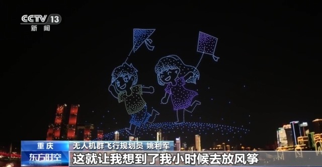 无人机群飞行规划员 姚利军:今天晚上有两个小孩在放风筝的图案,这就让我想到了我小时候去放风筝,童年的这种乐趣在成年的时候以科技的形式展现了出来,这种感觉很奇妙,也希望传达给更多的人,大家在看无人机表演之后能够感觉更开心、更快乐。