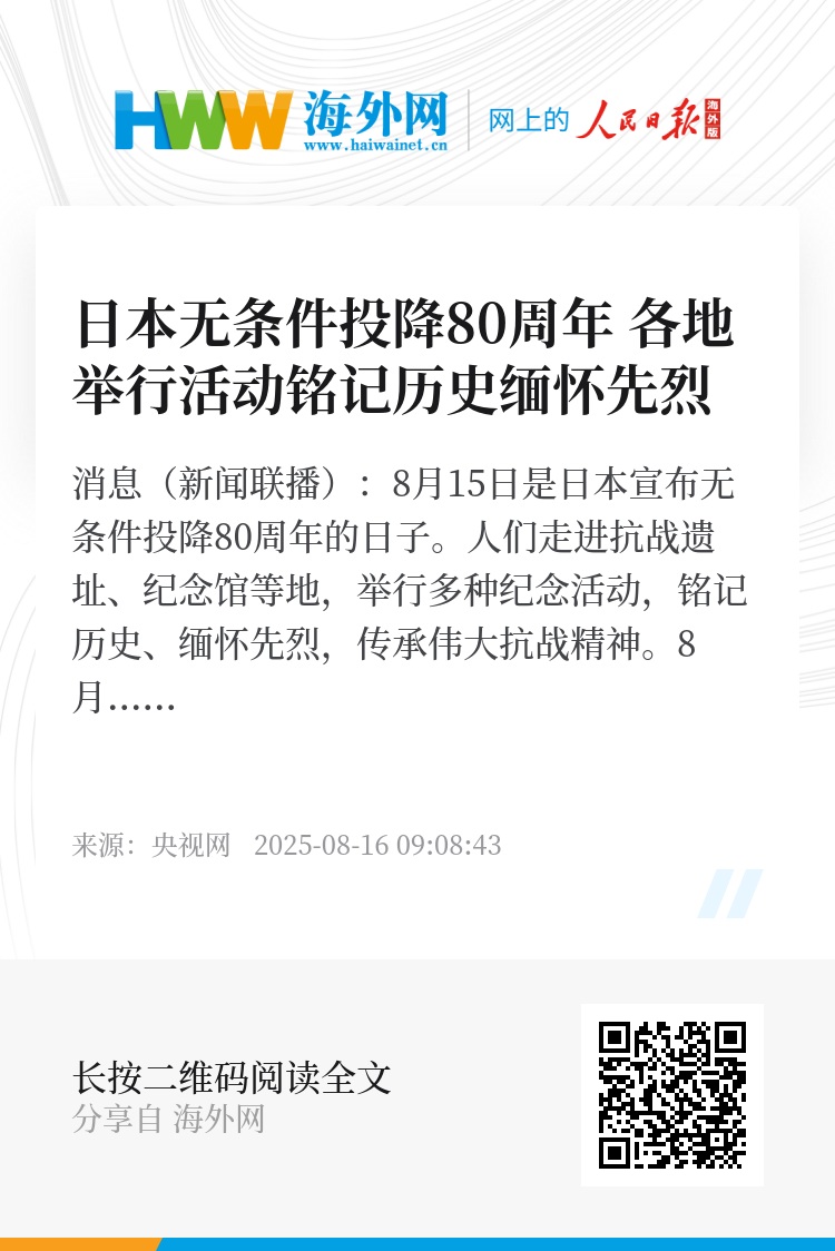 央视网消息(新闻联播):8月15日是日本宣布无条件投降80周年的日子。人们走进抗战遗址、纪念馆等地,举行多种纪念活动,铭记历史、缅怀先烈,传承伟大抗战精神。