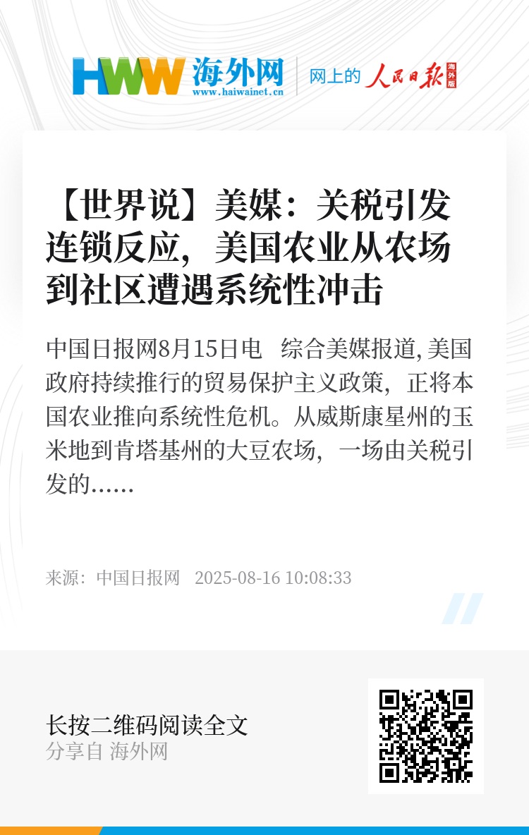 中国日报网8月15日电 综合美媒报道,美国政府持续推行的贸易保护主义政策,正将本国农业推向系统性危机。从威斯康星州的玉米地到肯塔基州的大豆农场,一场由关税引发的危机正在全美蔓延。