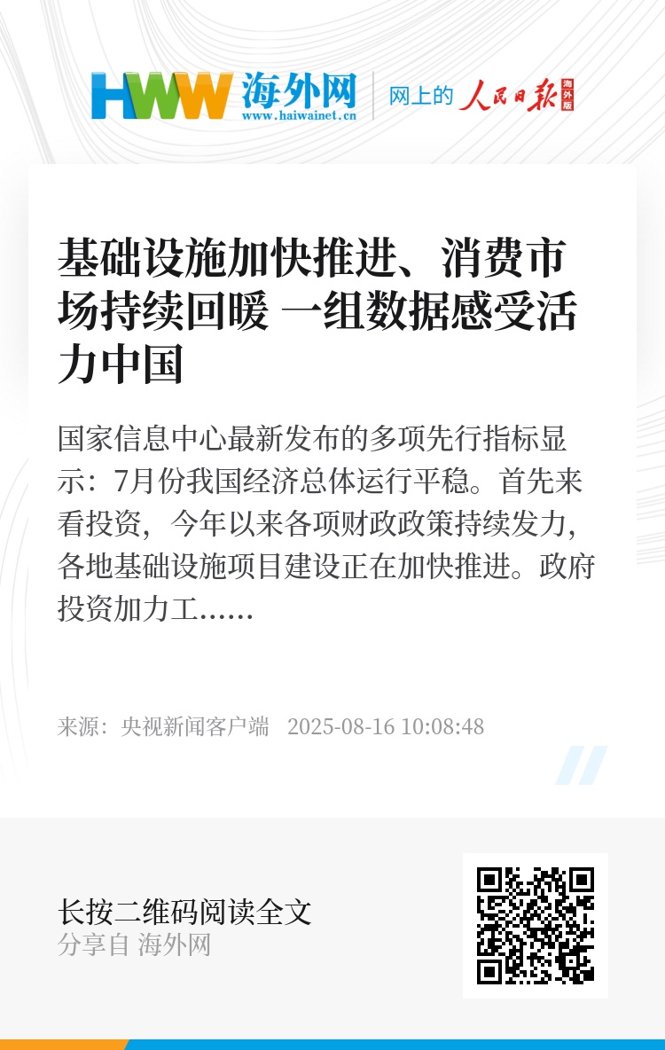 国家信息中心最新发布的多项先行指标显示:7月份我国经济总体运行平稳。首先来看投资,今年以来各项财政政策持续发力,各地基础设施项目建设正在加快推进。