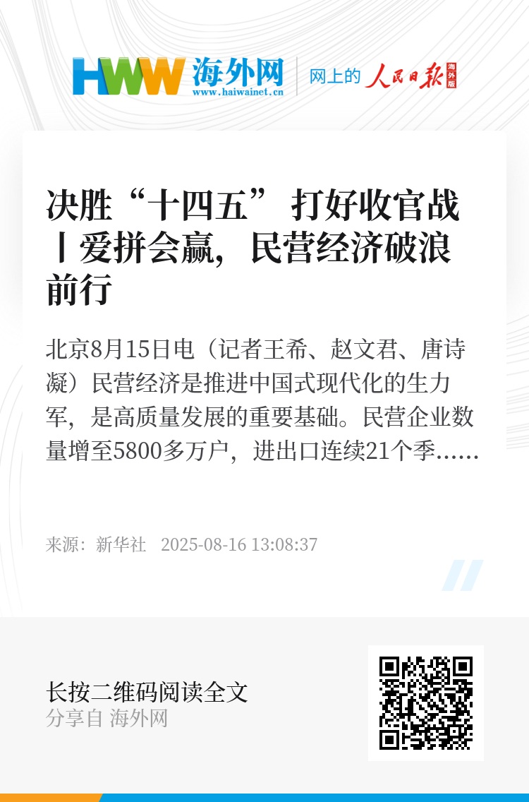 新华社北京8月15日电(记者王希、赵文君、唐诗凝)民营经济是推进中国式现代化的生力军,是高质量发展的重要基础。