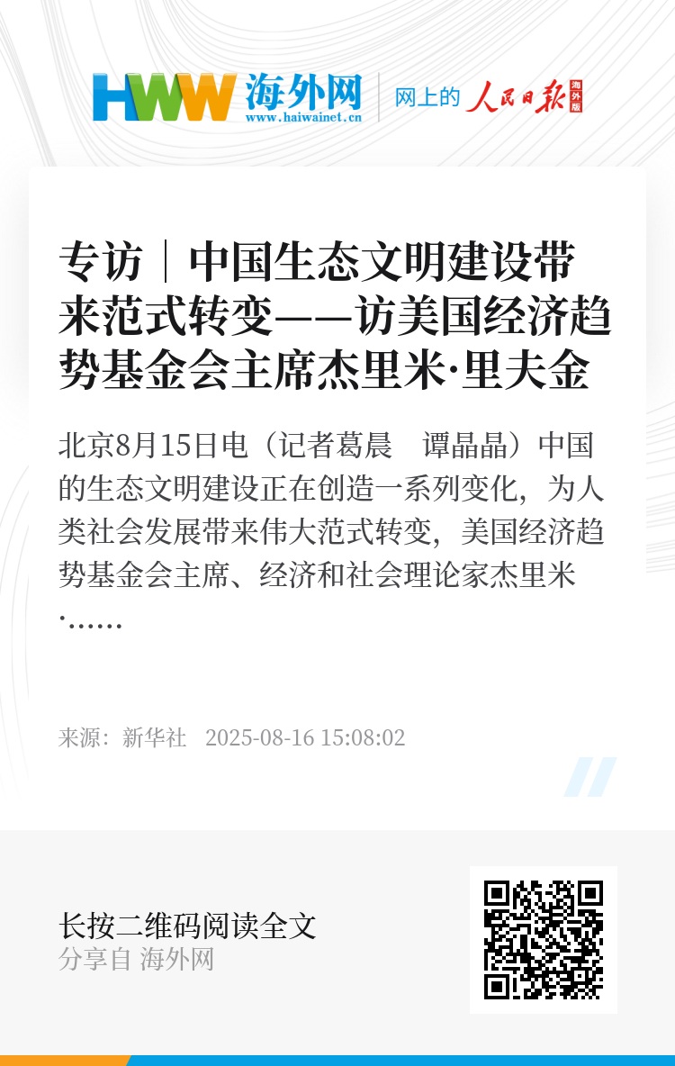 里夫金著有《第三次工业革命》《零碳社会》等畅销书。他说,中国的生态文明理念代表着人们看待人与自然、人与人关系的范式转变,中国不仅提出愿景,更是朝着生态文明的目标迈进。