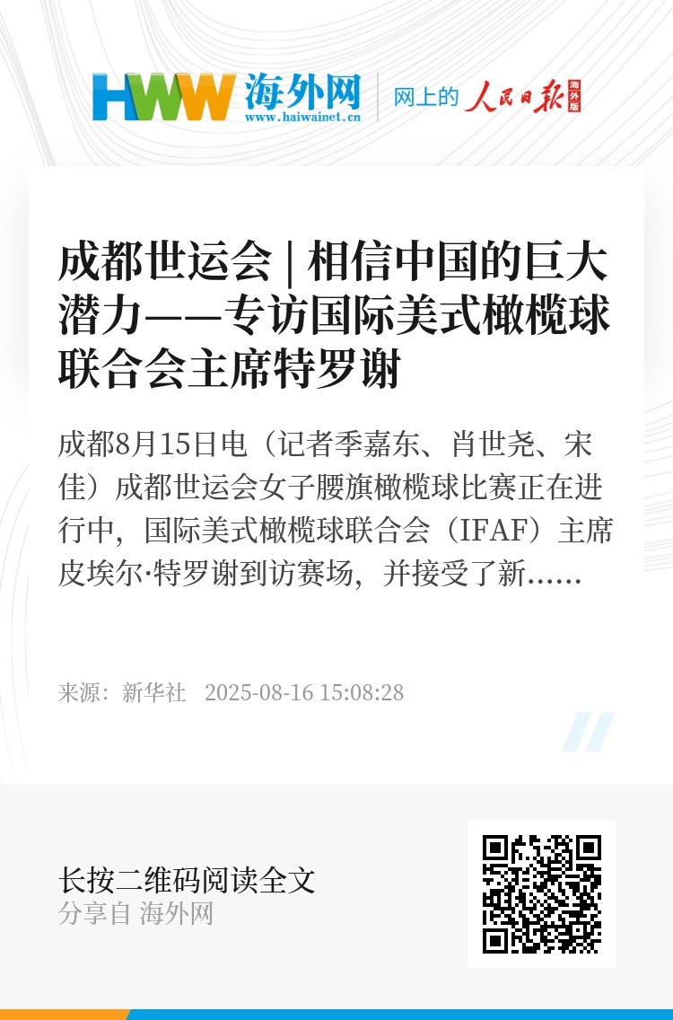 新华社成都8月15日电(记者季嘉东、肖世尧、宋佳)成都世运会女子腰旗橄榄球比赛正在进行中,国际美式橄榄球联合会(IFAF)主席皮埃尔·特罗谢到访赛场,并接受了新华社记者专访。特罗谢表示,腰旗橄榄球在本届世运会上大受欢迎,对IFAF和他本人都是一种鼓舞,他相信中国有巨大的潜力。