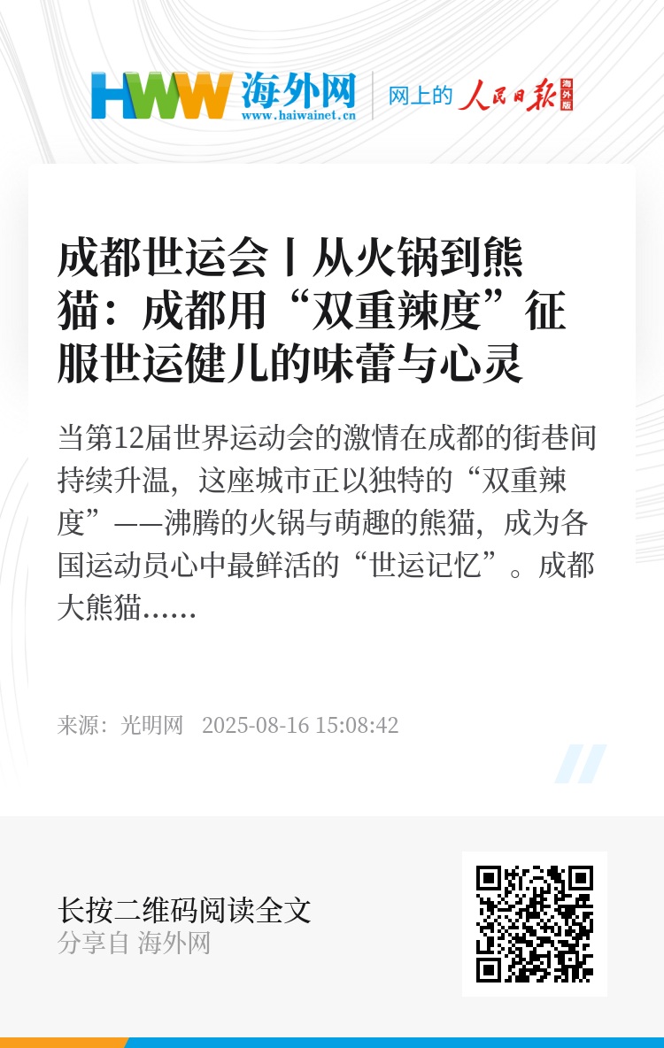 当第12届世界运动会的激情在成都的街巷间持续升温,这座城市正以独特的“双重辣度”——沸腾的火锅与萌趣的熊猫,成为各国运动员心中最鲜活的“世运记忆”。