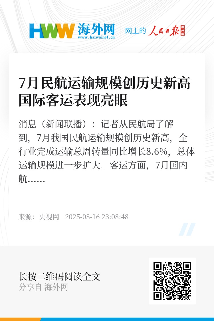 央视网消息(新闻联播):记者从民航局了解到,7月我国民航运输规模创历史新高,全行业完成运输总周转量同比增长8.6%,总体运输规模进一步扩大。