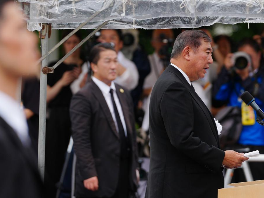 8月9日,日本首相石破茂在长崎举行的遭原子弹轰炸纪念仪式上发言。新华社记者 贾浩成 摄