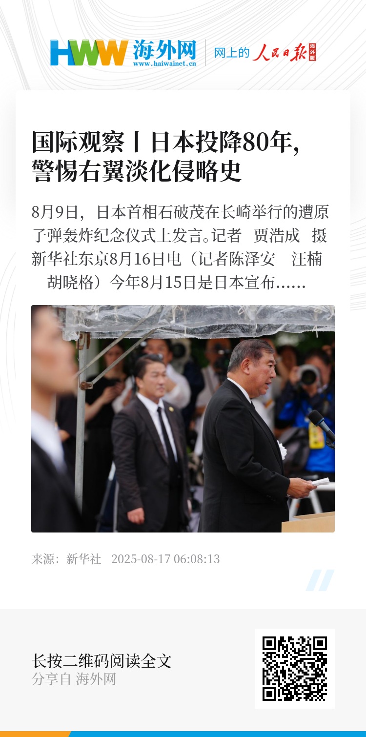 新华社东京8月16日电(记者陈泽安 汪楠 胡晓格)今年8月15日是日本宣布无条件投降80周年的日子。侵略战争期间,日本军国主义的罪行令许多国家特别是亚洲邻国饱受摧残与苦难,日本理应深刻反省侵略历史。
