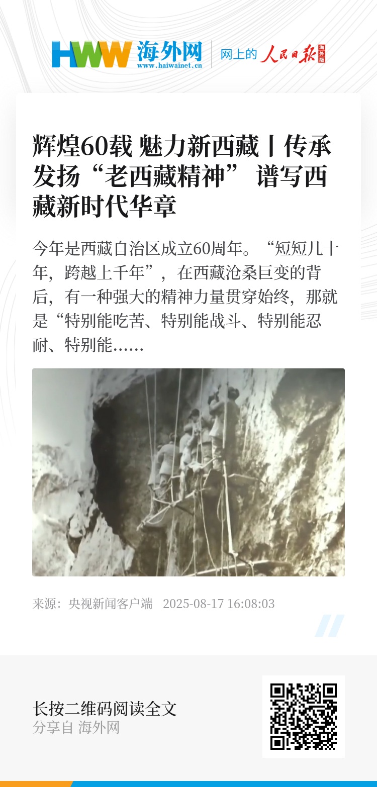 今年是西藏自治区成立60周年。“短短几十年,跨越上千年”,在西藏沧桑巨变的背后,有一种强大的精神力量贯穿始终,那就是“特别能吃苦、特别能战斗、特别能忍耐、特别能团结、特别能奉献”的“老西藏精神”,它激励着一代代西藏的建设者在雪域高原不断创造出一个个人间奇迹,成为推动雪域高原发展的强大动力。