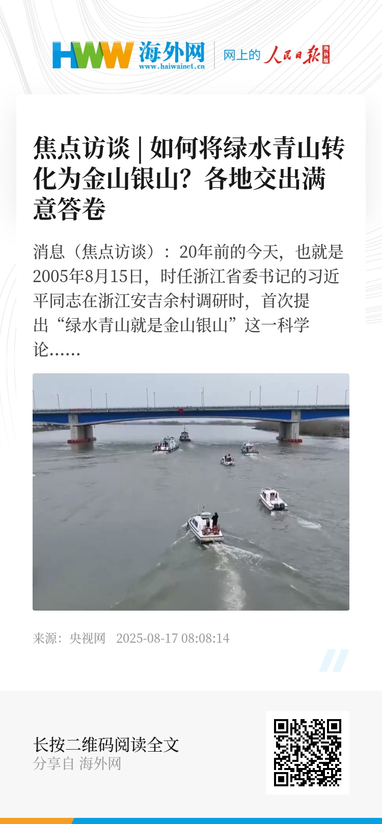20年来,由“两山”理念引发的深刻变革正在重塑中国的发展方式和中国人民的生活方式。它用一个个生动的实践告诉我们:人不负青山,青山定不负人。新征程上,坚定不移走生态优先、绿色发展之路,不断完善生态文明制度体系,协同推进降碳、减污、扩绿、增长,我们一定会创造更多生态奇迹和绿色发展奇迹,谱写人与自然和谐共生的现代化新华章。