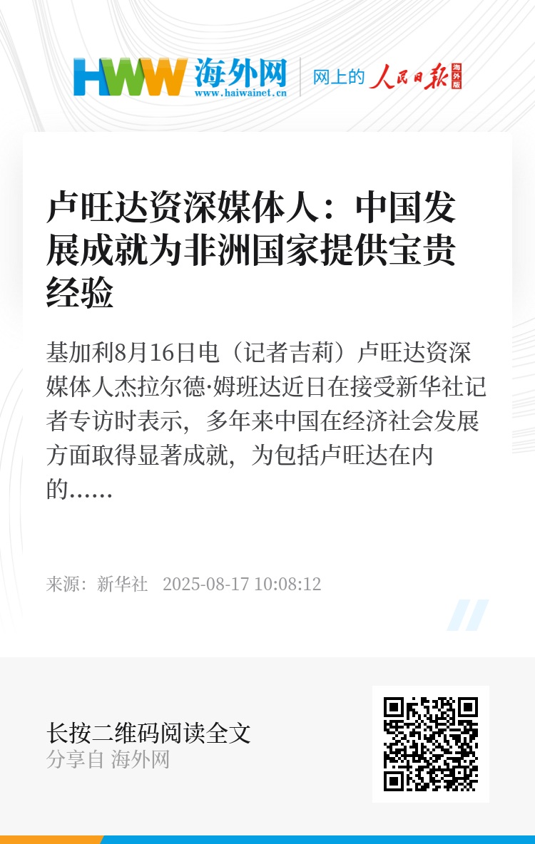 新华社基加利8月16日电(记者吉莉)卢旺达资深媒体人杰拉尔德·姆班达近日在接受新华社记者专访时表示,多年来中国在经济社会发展方面取得显著成就,为包括卢旺达在内的非洲国家提供了有益借鉴。