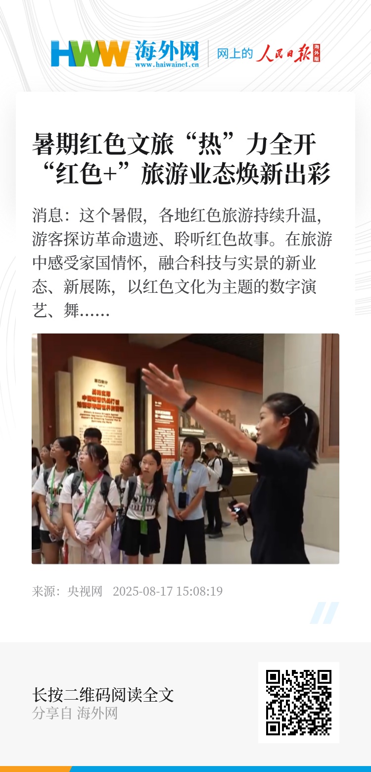 各地充分依托当地丰富的红色文化资源,精心打造特色旅游线路,让人们在游览中汲取奋进力量,传承红色基因。井冈山革命博物馆暑期游客络绎不绝。游客们在一件件珍贵的历史文物前驻足,仔细聆听讲解员的解说,一个个信念坚定、艰苦奋斗的感人故事让前来参观游客深受教育。在福建长汀,这里持续深化长征国家文化公园相关史料、文物,借助科技手段,通过沉浸式互动体验,开发特色精品课程等;同时,还将红色旧址群、红九军团长征出发地等红色景点串联,打造一系列红色研学精品旅游线路,让红色文化更可观可感。